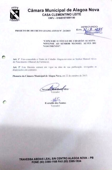 "Concede o Título de Cidadão Alagoa-Novense ao Senhor Manoel Alves do Nascimento"
