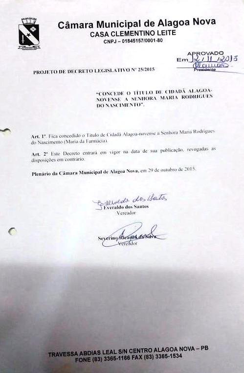 "Concede o Título de Cidadão Alagoa-Novense à Senhora Maria Rodrigues do Nascimento"
